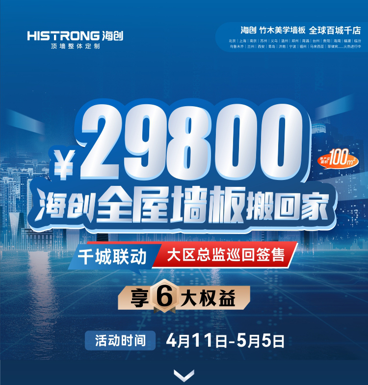 省錢的機會來了!海創(chuàng)千城聯(lián)動 大區(qū)總監(jiān)巡回簽售千萬回饋·墻購51·提前省如果您正在考慮裝修那么一定要來海創(chuàng)看看51提前省、大區(qū)總監(jiān)全國巡回簽售豪禮不停鎖定名額、勁抽好禮100%中獎1元秒殺、現(xiàn)金紅包、超低折扣活動期間下單即有機會拿到55寸小米電視機!活動時間:4月11日-5月5日快來報名!有驚喜!海報海創(chuàng)大區(qū)總監(jiān) 51全國巡回簽售鎖定6大權(quán)益1、報名免費參加抽獎活動,100%中獎;2、進(jìn)店即可領(lǐng)取海創(chuàng)定制禮品一份;3、進(jìn)店即可享受免費量房、免費平面布局、免費出實景效果圖;4、報名客戶可享受總部直播間4月19日、4月29日晚上7點1元秒殺和免費抽豪禮活動;5、活動期間下單可享受4月29日晚上7點海創(chuàng)總部直播間抽獎活動,55寸小米電視機眾多好禮等你來抽;6、享受大區(qū)總監(jiān)簽售專屬特批政策。直播活動額外驚喜福利:第一場4月19日 晚19點第二場4月29日 晚19點掃描下方二維碼進(jìn)入活動頁面海創(chuàng)頂 墻 門 柜 整裝定制選擇海創(chuàng)就“購”了!產(chǎn)品一:8㎡抗油污一廚一衛(wèi)吊頂套餐海報想要...安全環(huán)保、快速入住、省錢又省心海創(chuàng)鋁蜂窩大板一定是你的首選產(chǎn)品二:4m²鋁蜂窩大板廚房套餐海報更多爆款 超低折扣送送送不停產(chǎn)品三:Turbo S 速暖空調(diào)/無界線性暖空調(diào)再送價值1996元4m²鋁蜂窩大板再送價值599元18mm線形燈海報想要...簡約風(fēng)客餐廳、韓式田園臥房快樂城堡兒童房你想要的海創(chuàng)都能幫你實現(xiàn)產(chǎn)品四:8㎡竹木美學(xué)易潔背景墻海報選擇海創(chuàng) 品牌有保障裝修一站就“購”了產(chǎn)品五:海創(chuàng)全屋墻板套餐(限產(chǎn)證面積100平方)海創(chuàng)五一活動千萬回饋·墻購51·提前省全程禮遇超值鉅惠我沖了?。?!more+