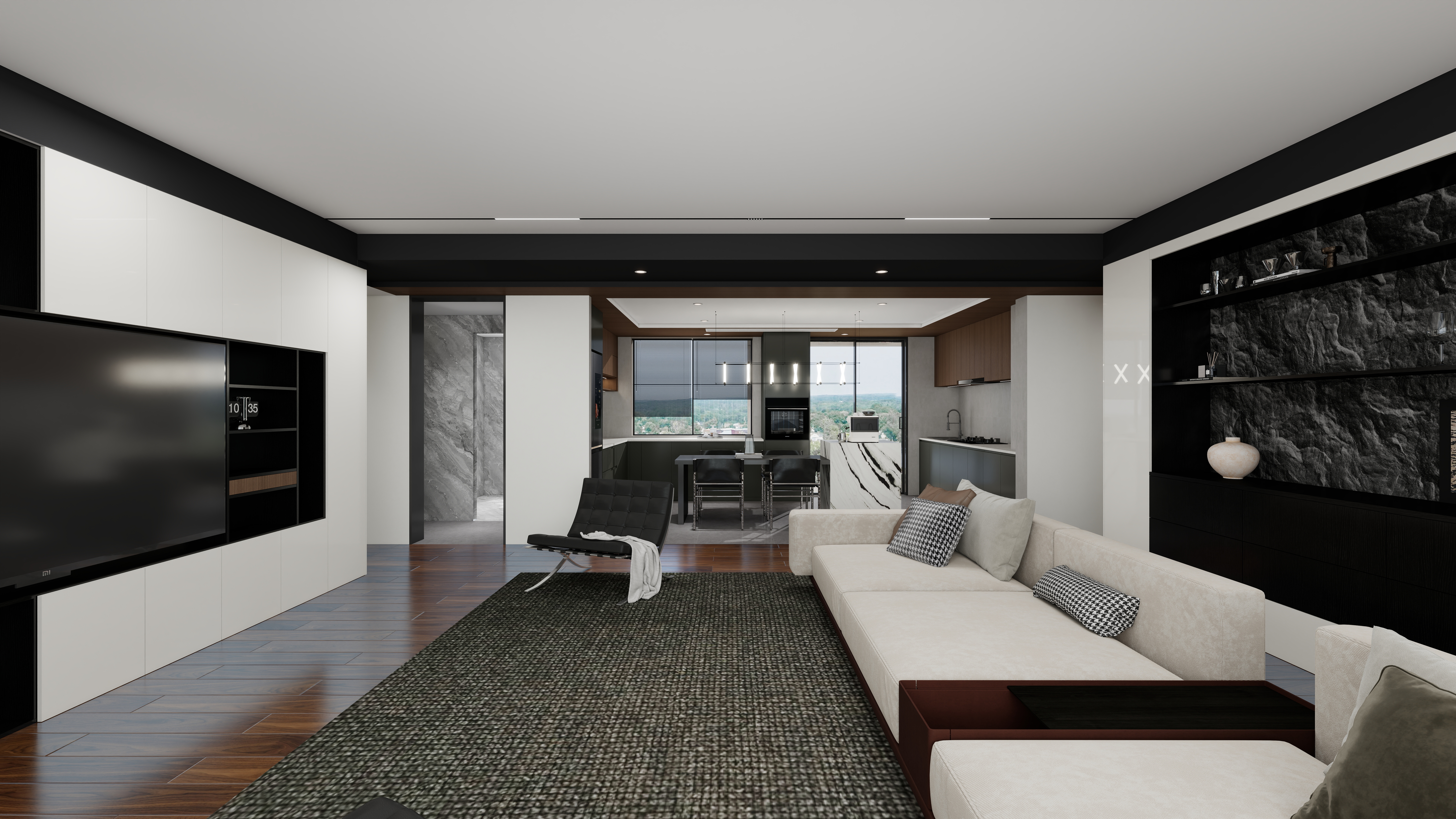 這套120㎡的居所,以侘寂美學為底色,通過頂墻門柜極致的黑白對比,勾勒出空間的清晰輪廓與深邃層次。黑,并非純粹的暗色,而是沉穩(wěn)的錨點;白,也非簡單的空曠,成為呼吸與光影的畫卷。客廳:定制的秩序感客廳的雙背景墻均采用頂天立地的定制柜體,以內(nèi)嵌形式消弭冗余。黑白柜面交織拼接,如同精心裝幀的書卷,在提供海量收納的同時,刻畫出立體而干凈的空間輪廓,奠定沉穩(wěn)大氣的基調(diào)。餐廚區(qū):圍合的溫度場采用開放式圍合布局,空間通透流暢。視線可毫無阻隔地延伸至廚房,讓家人備餐時的身影與笑語成為最動人的風景。一組深棕色的木質(zhì)吊柜恰到好處地點綴其間,其溫潤的質(zhì)感瞬間柔化了黑白的冷峻,為空間注入一絲暖意與高級感。玄關(guān):延伸的巧思雖尺度精巧,卻通過延展式布局與半開放設(shè)計,巧妙化解局促。它既是歸家儀式感的起點,也高效承載了日常進出所需的收納,功能與形式達成微妙平衡。書房:專注的結(jié)界書房是黑白對比最為鮮明的場域。極致的色彩分割摒除一切紛擾,營造出冷靜、純粹的思考環(huán)境,有效提升專注力,讓精神在此迅速沉潛。臥室:織就的安寧雙臥室延續(xù)黑白主調(diào),并以深淺不同的棕色調(diào)和,交織出寧靜而舒適的睡眠氛圍。舍棄傳統(tǒng)飄窗布局,釋放出更多可利用空間,讓休憩體驗更為寬松自在。主衛(wèi):理性的升華主臥衛(wèi)生間采用同色系一體化設(shè)計,大理石墻面與蜂窩板無縫銜接。獨特的線性美學頂面設(shè)計,在純粹的黑白與利落的直線中,將功能與理性美學升華至新高度。在這里,生活被還原成一種素樸的儀式。每一處設(shè)計都服務(wù)于居住的本質(zhì)——在鮮明的對比中尋得平衡,在質(zhì)樸的材質(zhì)里觸摸溫度,最終刻畫出一個鮮明、從容、充滿理性與深情的生活現(xiàn)場。more+
