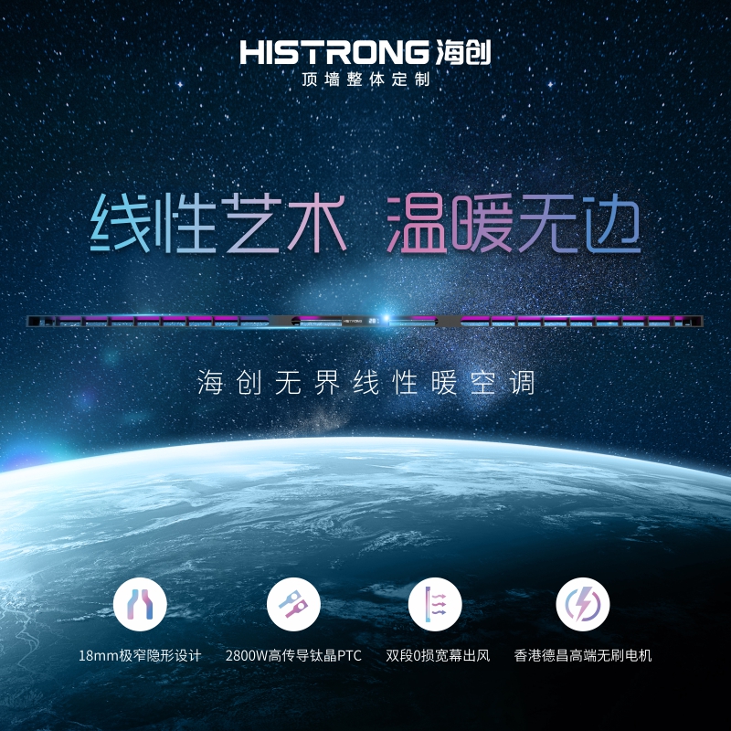 璀璨而來,耀世而出海創(chuàng)無界線性暖空調(diào)融合前瞻設(shè)計,續(xù)寫極致沐浴體驗線性藝術(shù),溫暖無界即刻見證三重溫暖 熱力無邊1、香港德昌高端無刷電機1700轉(zhuǎn)/分鐘轉(zhuǎn)速帶來的澎湃動力,是普通滾珠軸承電機的1.32倍動力,搭配2800W鈦晶PTC,迅速傳輸熱力,讓暖風(fēng)迅速籠罩整個浴室空間。2、2800W高傳導(dǎo)鈦晶PTC使用2800W高傳導(dǎo)鈦晶PTC發(fā)熱塊,99%熱能轉(zhuǎn)換,搭配香港德昌高端無刷電機,快速釋放熱量,也讓洗浴等待時間縮到更短。即使使用十年,熱衰退率僅為7%,長久溫暖洗浴效果保持。3、雙段0損寬幕出風(fēng)采用直排直吸速暖技術(shù),1米超長面板寬幕出風(fēng),75cm雙段式出風(fēng)口,可360°輸出熱氣;“全熱風(fēng)”設(shè)計、0損直吹,可迅速將熱量送達浴室各個角落,10秒速熱,冬季洗浴無需等待。線性藝術(shù) 無界魅力1、18mm極窄線性設(shè)計,隱于天際之上18mm寬度極窄線性設(shè)計,猶如一線天般隱匿于吊頂之上,簡潔而大氣。2、一體式面板貫穿,搭配博格更顯輕奢1米超長一體式面板設(shè)計貫穿頂部,無需轉(zhuǎn)換框便可完美匹配博格鋁蜂窩大板,普通吊頂也能安裝使用。區(qū)別傳統(tǒng)取暖分離式取暖模塊設(shè)計,更顯精致與奢華。3、六色彩虹燈幕,曼妙洗浴氛圍紅、玫、藍、綠、橙、紫六色彩虹氛圍燈設(shè)計,長條光影氛圍燈帶隱匿于出風(fēng)口,跟隨不同功能而切換,營造夢幻般的洗浴氛圍,沐浴的心情都跟著變得愉悅。海創(chuàng)無界線性暖空調(diào)10S速熱從此陷入浴室的溫柔沉醉暖空調(diào)的溫暖魅力more+
