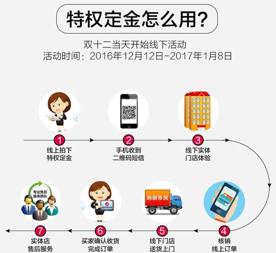 雙十二當(dāng)天登錄天貓海創(chuàng)旗艦店拍下10元特權(quán)定金,到海創(chuàng)門店消費(fèi)即可抵用100元。特權(quán)定金使用時(shí)間為2016年12月12日-2017年1月8日。