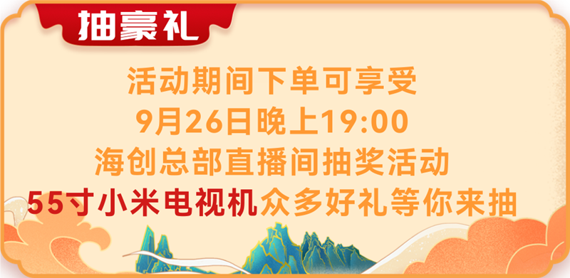 3、抽豪禮:活動期間下單客戶可享受9月26日晚上7點(diǎn)海創(chuàng)總部直播間抽獎活動,55寸小米電視機(jī)眾多好禮等你來抽