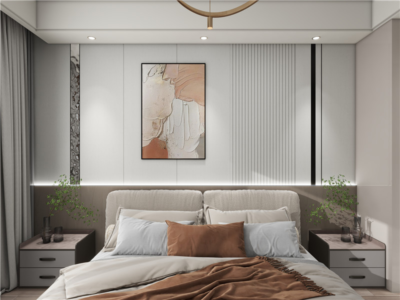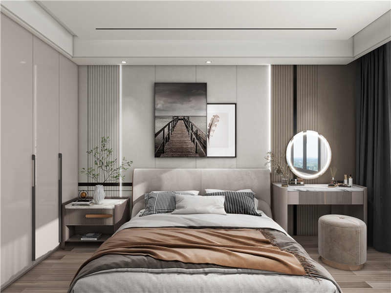 當(dāng)月光灑滿房間,與新中床頭背景墻相互映襯,也是一種在家就能享受的別樣浪漫了吧。定制柜與墻面的設(shè)計(jì)不拘一格,利用柜子的延伸做了床頭桌的造型,既能擺放物件,也能做梳妝臺(tái)使用。