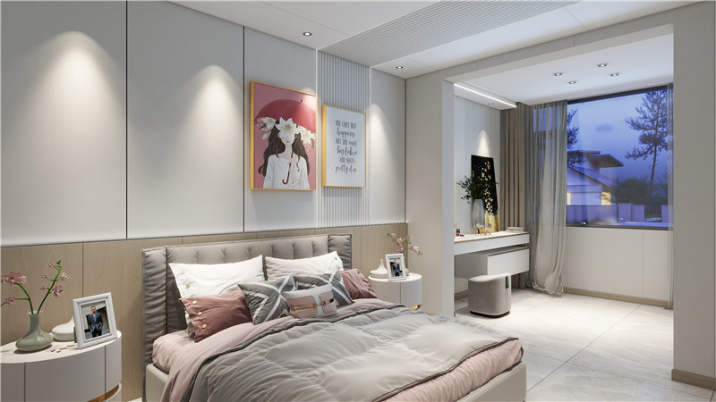 打破傳統(tǒng)飄窗設(shè)計(jì),讓臥室做了簡(jiǎn)單的分區(qū),既是化妝間、又是陽(yáng)臺(tái)區(qū),也可以是衣帽間、活動(dòng)室,增強(qiáng)空間實(shí)用性。整體淺色床頭背景,能讓身心快速得到放松。